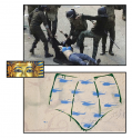 One image that struck me featured “Tantawi’s underpants” — a popular motif, apparently, and one that seemed to me to make an interesting response / riposte to the iconic “blue bra girl” so shamelessly exposed by the Egyptian police: