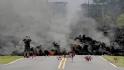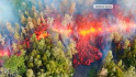 Lava burns across a road in the Leilani Estates subdivision as an unidentified person takes pictures of the flow, Saturday, May 5, 2018 near Pahoa, Hawaii. Offerings of Hawaiian ti leaves, rocks and cans to the fire goddess Pele lie in the street in front of the lava. (AP Photo/Caleb Jones)