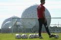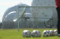 People play football at a field next to radomes of the digital communications listening station of the Bundesnachrichtendienst, the German intelligence agency, on June 2, 2015, in Bad Aibling, Germany.