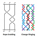 The art of change-ringing in British churches and among hand-bell ringers is indeed the classic example of highly constrained and patterned musical counterpoint, so I happily Googled away in search of a change-ringing pattern comparable to my braiding patternc[left side, below], and came across the pattern [right side] in a page on the Cambridge Surprise Minor changes: