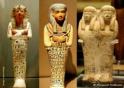 (From left) Painted shabti of Ramesses IV. 20th Dynasty; decorated shabti of the Lady of the House, Sati – reportedly from Saqqara. 18th Dynasty, reign of Amenhotep III; and, a double shabti of Huy and Ipuy, a father and son pair. 18th Dynasty. Louvre Museum, Brooklyn Museum and Museo Egizio, Turin, Italy. (Photos: Heidi Kontkanen and Margaret Patterson)