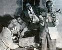 To the left in the same image, he’s shown with Louis Armstrong — Satchmo — who has just presented him with a trumpet.